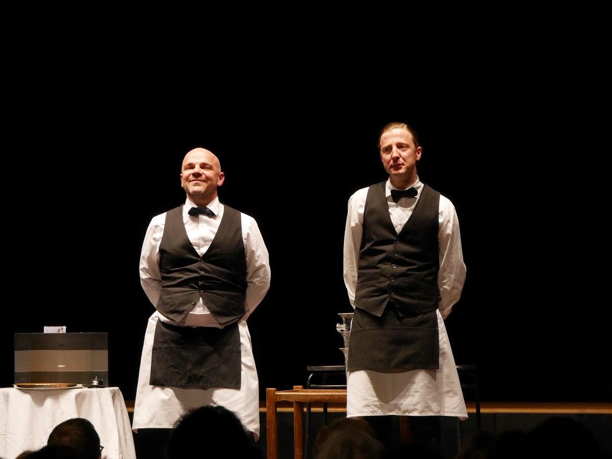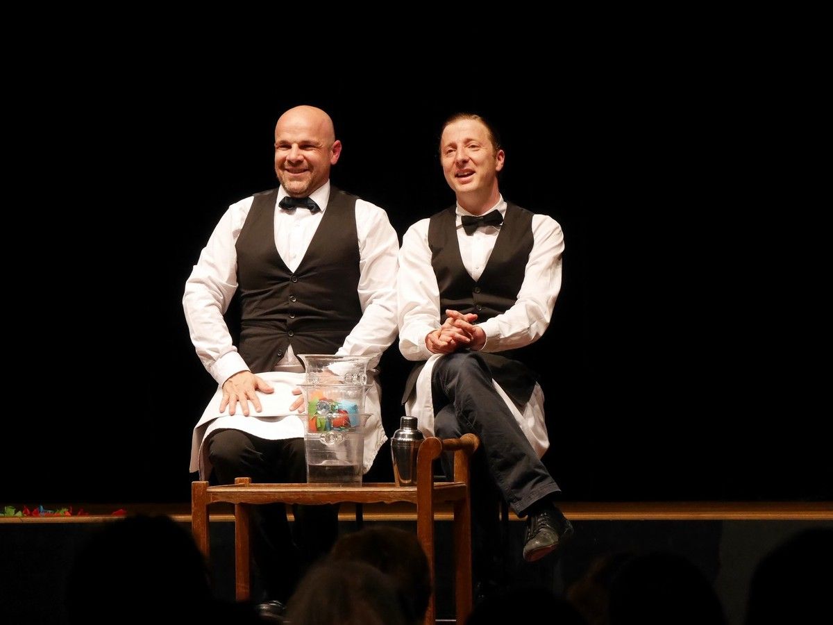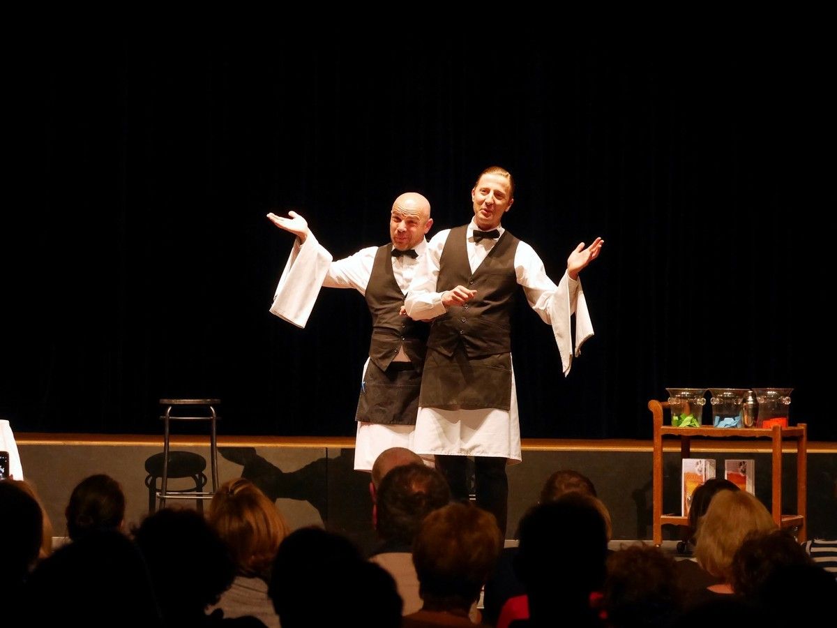Le public est venu en nombre ce jeudi 9 mai au CAPJ. Ils étaient 150 à découvrir Jérôme Hudeley et Julien Jobert, en tenue de garçons de café, sur la scène fontainoise. Aguerris aux techniques de l’improvisation théâtrale, ils étaient très en verve. Leur complicité, leur humour, leur créativité et leur spontanéité ont enthousiasmé le public ravi de se voir servir de dynamiques cocktails de mots, des histoires tour à tour truculentes, piquantes, drôles, déjantées, rocambolesques, contées et jouées à partir d’ingrédients … proposés par le public lui-même !
